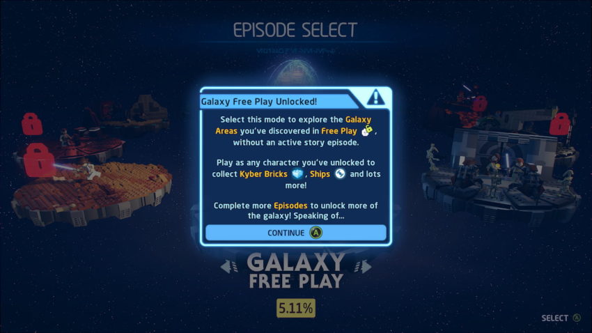 The Galaxy Free Play mode is only available after completing one of the nine Star Wars episodes. When you initially start the game, you can only access Episode I, IV, or VII, which are the beginning of any of the three sagas from the Star Wars movies. After completing one of these three episodes, Galaxy Free Play will be available.