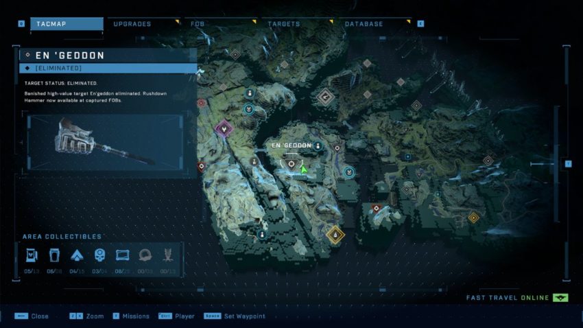 To get the Rushdown Hammer, you must first complete the Pelican Down mission and start the Sequence mission. Once that is accomplished, you will need to track down En ‘Geddon. This high-value target resides in the southeastern section of the map north of one of the spires you need to go to for the Sequence mission. You can easily reach this target by traveling to FOB Hotel if you have it unlocked.