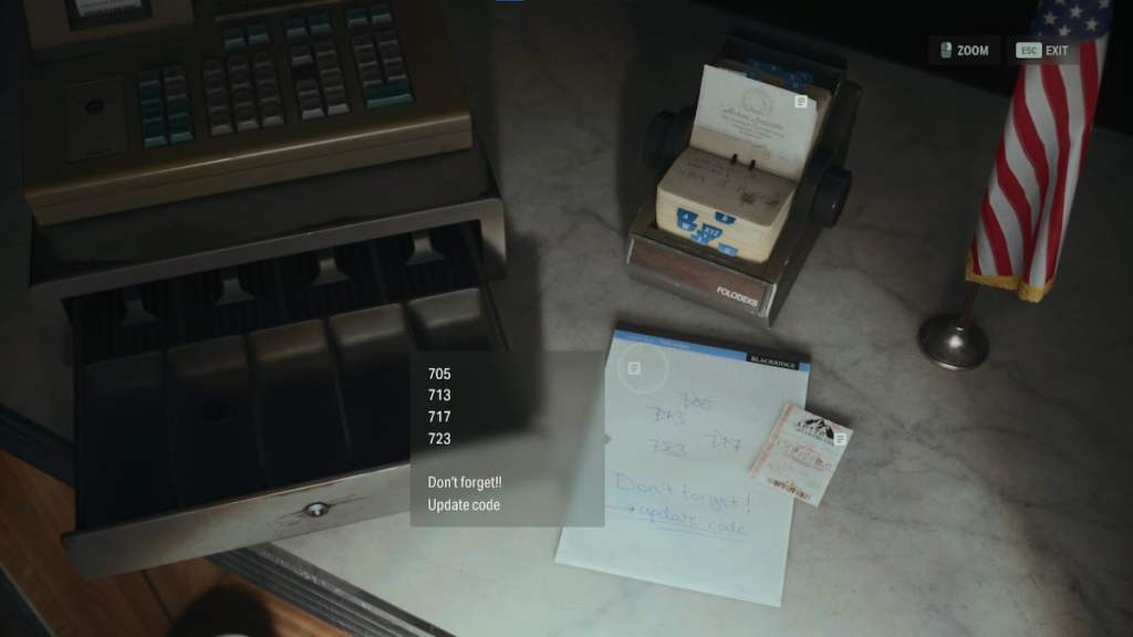The Sawed-Off Shotgun will be hanging on the back wall, but it will have a lock that requires a combination for you to unlock it. There’s a note that says you need to make your way to the Cash Register to unlock it. When you reach the register, interact with it, and you’ll find a notepad next to the register with a list of the codes that were previously assigned to the padlock. Unfortunately, none of the old codes will work on the padlock, and you’ll need to find the new combination to unlock this helpful weapon for your Alan Wake 2 campaign.