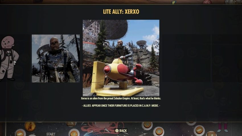 The second ally you will unlock is Xerxo. This ghoul ally claims he is not from our planet. Just like Katherine, he can be used as a vendor in your C.A.M.P. You will obtain this ally after reaching rank 49 on the season scoreboard. Talking to Xerxo will give you a buff that increases your character’s agility for a while. The buff will also decrease the cost of fast traveling.