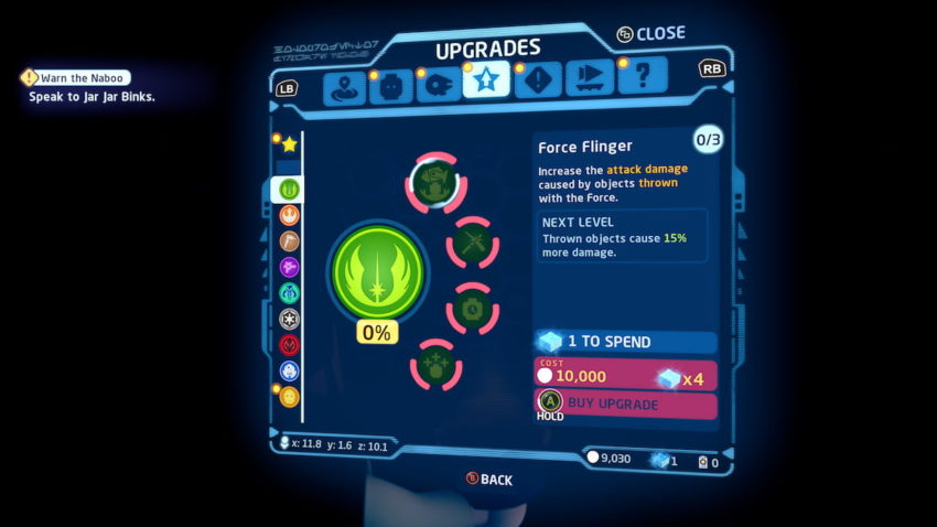 You can click any of the nine classes and view the available upgrades. By highlighting any upgrades you can purchase, you’ll see the requirements. All upgrades require you to use Kyber Bricks and studs to buy them. You can find Kyber Bricks by completing puzzles, completing missions for the first time, and finishing up challenges available throughout all episodes.