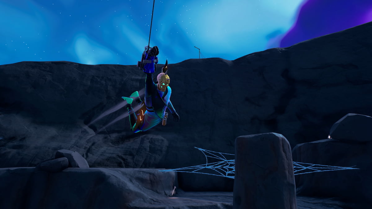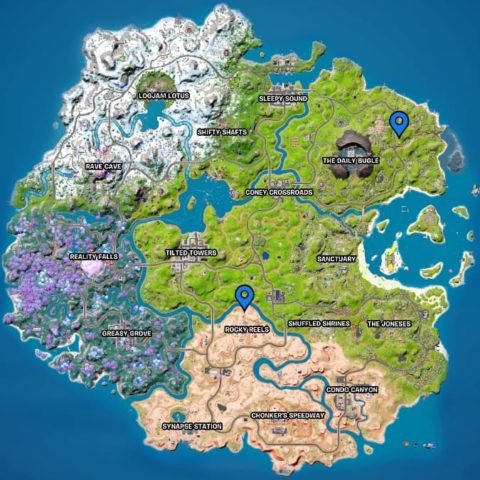 The biggest hurdle in this challenge will be to find a Grapple Glove that is relatively close to a zipline. So, we recommend either collecting the Grapple Glove that is set east of The Daily Bugle or the glove located on the north side of Rocky Reels (as marked below). From there, those who have picked up their Grapple Glove near The Daily Bugle can find ziplines on the northern end of the named location, as the closest ziplines for players in Rocky Reels can be found at the cliffs north of Chonker’s Speedway.