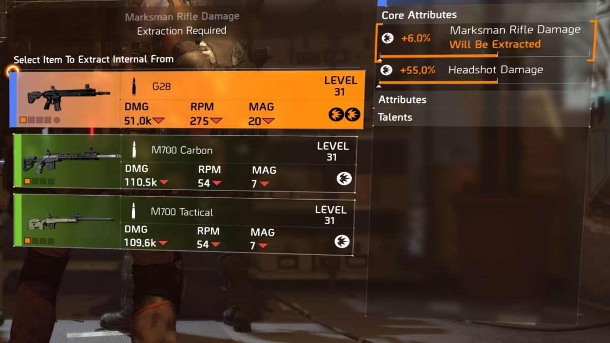 In the Recalibration Library, you can view all of the extracted traits you’ve acquired through your time of playing The Division 2. You can see how many traits are available for a weapon, and when you highlight a specific trait, you can see the highest possible percentage tied to it. For example, if you have extracted a Marksman rifle with 11 percent damage, you can see that the highest number you can reach is 15 percent, so you still have some ways to go before you have the best in your library. Regardless, other Marksman rifles that you have on your person that have a lower headshot damage rating than 11 percent can receive it if you bring it to the table.