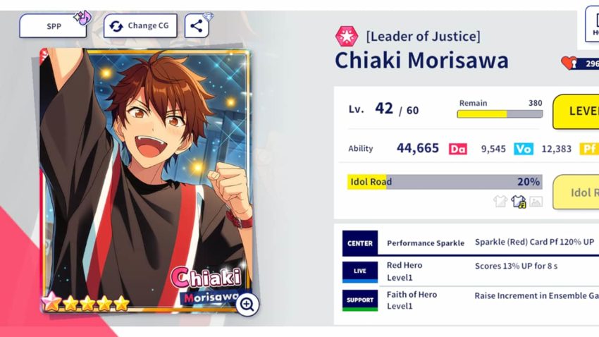 Also, on the Idol Road, depending on the card, will be extras such as outfits, stories, and a node called “Perform,” which unlocks something called Special Performance (SPP.) By unlocking this node, if this particular card is placed in the center, the character will perform the SPP during a specific song if you’ve successfully completed Ensemble Time. Cards with a rarity of four stars or higher will have a “Perform” node on their Idol Road. To see what song your SPP can be performed on, go back to your card’s screen, and tap on the “SPP” button located in the top left of the screen. This tells you which song the card’s SPP is for. Just like Da, Vo, and Pf nodes, you’ll also need to use gems for these.