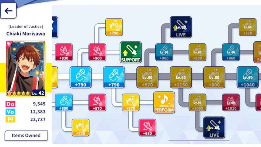 Idol Roads are how you’ll level up your character’s three stats: Dance (Da), Vocal (Vo), and Performance (Pf). By leveling up these stats, you’ll get a higher score on the songs. To unlock these nodes, you’ll have to use gems you get from Lives and meet the level requirement for them. For example, some nodes can’t be unlocked until the card’s level is at level 60. So, you’ll have to level up your card using tickets or grinding Lives.