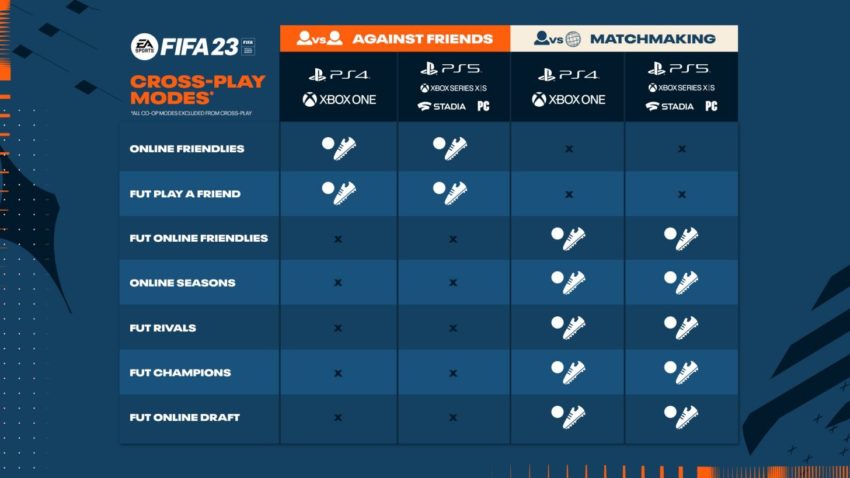For FIFA 23, crossplay will be compatible for FUT Division Rivals (except Co-Op), FUT Champions, FUT Ultimate Online Draft, FUT Online Friendlies (except Co-Op), FUT Play a Friend, Online Friendlies, Online Seasons (except Co-Op Seasons) and the Virtual Bundesliga competitive game mode that is available to players based in Germany. This information was confirmed on July 20, alongside the release trailer of FIFA 23.