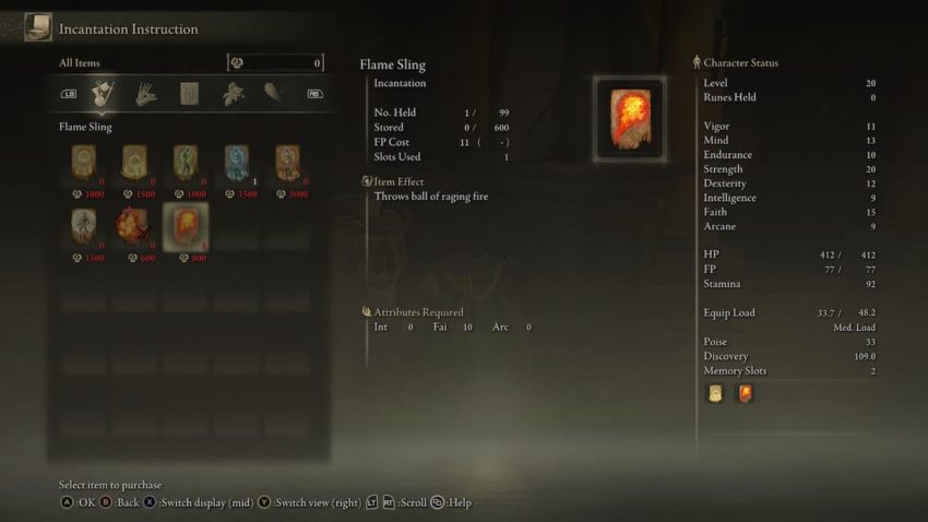 You can purchase your first few Pyromancy Incantations from Brother Corhyn at The Roundtable. Catch Flame is a mere 600 Runes, while Flame Sling is only 800 Runes. Brother Corhyn will also sell additional non-Pyromancy Incantations such as Heal and Rejection, if you’re interested.