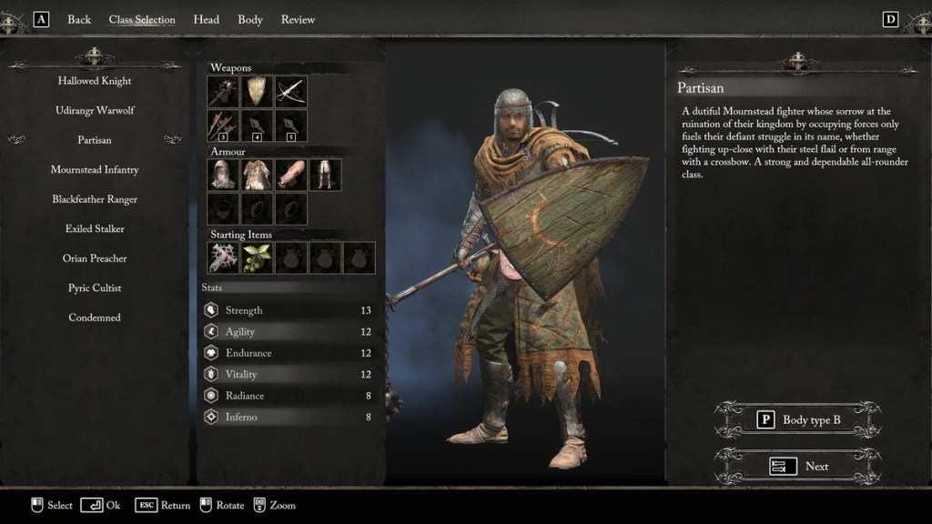 The Mournstead Infantry class likes to keep their enemies at a distance. Their spear does a decent amount of damage while also being extended, which allows you to hit enemies from a bit of range. They also have a javelin throw, which can hit enemies from further away. This class has a shield to protect them from blocks, but it doesn’t provide as much physical protection as the Knight or Partisan.