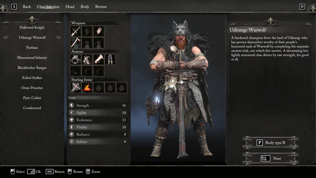 The Udirangr Warwolf is all about dishing out damage. You will be doing a lot of rolling with this class because the hulking character wields their weapon with both hands. If you’re good with timing dodge rolls in games, then this might be the class for you. Enemies are going to die a lot quicker as Warwolf Sword does the most amount of damage from the class selection on offer. The weapon also scales better compared to some of the others once you start upgrading it. The Udirangr Warwolf lacks a lot of defensive stats, though, which makes them a bit of a glass cannon.