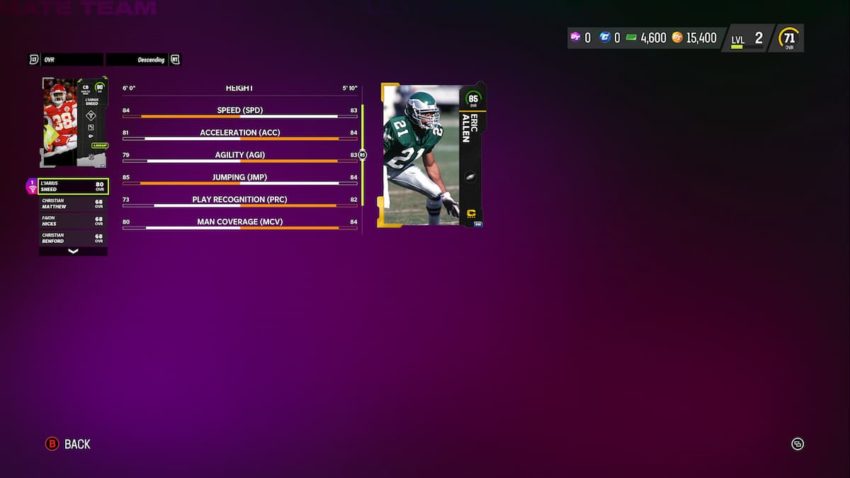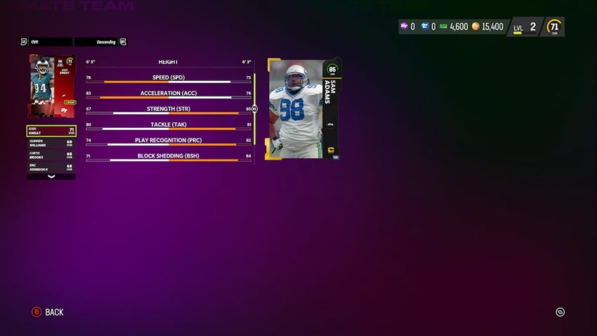 Now, let’s move to the other three. Keyshawn Johnson is a big target that has solid Speed and Catching. Eric Allen also has solid stats, but height may be a bit of an issue. And then there’s Sam Adams, a nose tackle that has good overall stats, and Speed that can make the former Seahawks defensive lineman a formidable option.