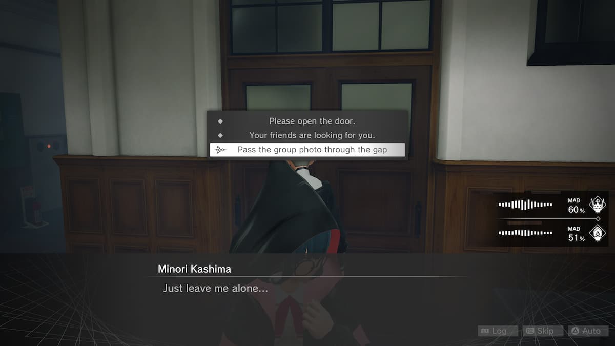 You’ll acquire a group photo, which you must take back to room 1-C. This is the classroom earlier in the hallway that has one entrance barricaded by desks. Approach the other entrance to be greeted by Minori Kashima on the other end. Minori opens the door after you slip the photo through the gap.