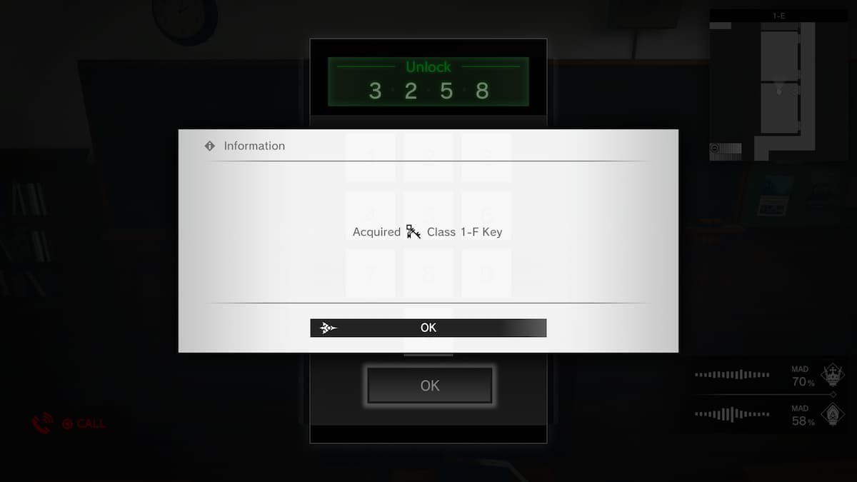 The code for the only locker on the third floor is 3258. This one is also mandatory for story reasons. Your reward is the 1-F classroom key.