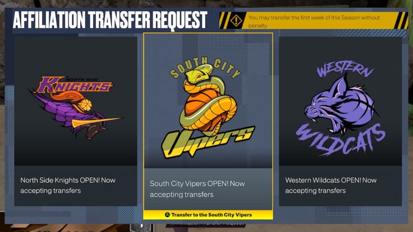 There are four affiliations: the North Side Knights, the South City Vipers, the Beasts of the East, and the Western Wildcats. Upon starting out in MyCareer, players in NBA 2K23 will automatically be assigned to one of the four. However, this can be changed.