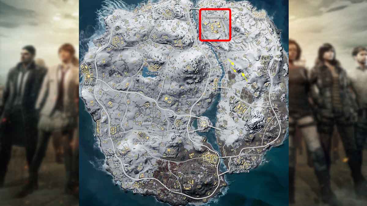 If you are heading west, Dobro Mesto should be your first choice to land. This place has many houses you can explore to get the best loot in Vikendi. Land near the fountain and explore the houses on its right. A lot of loot is inside the houses; you will get vests, Shotguns, Rifles, and other items. Buildings marked with a red arrow on the map are important to look at first. The second arrow in the above image takes you to the upper floor of the big building, where a lot of loot has scattered on the floor and in racks. Keep this a priority if you land in this region.