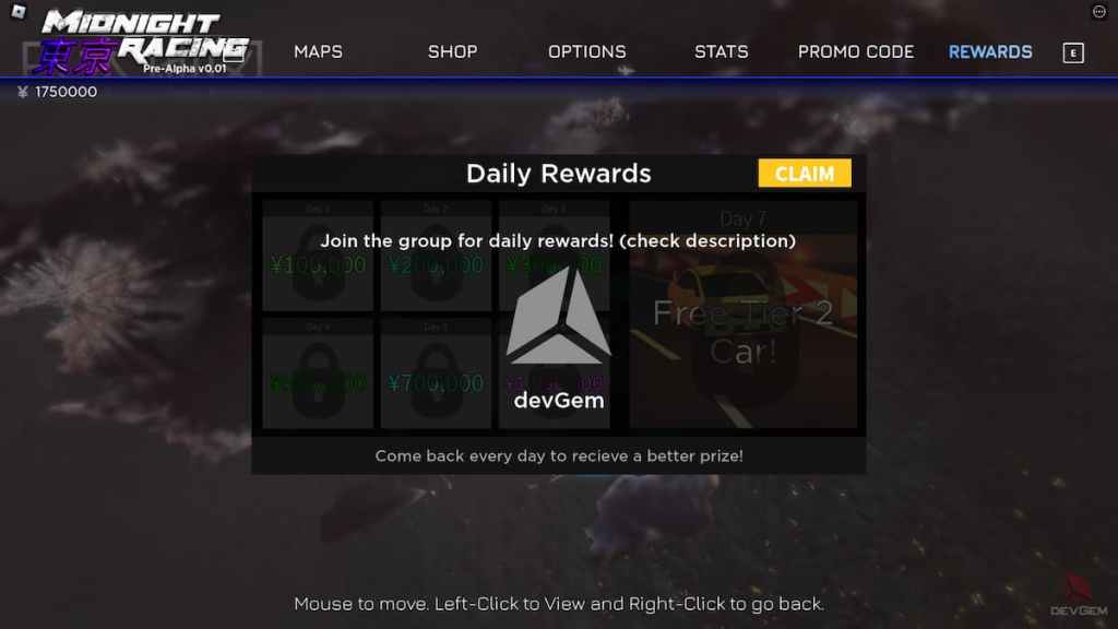 If you are hunting more free rewards in Roblox Midnight Racing Tokyo, there is another way besides codes. Join the game’s Roblox Group and claim exclusive rewards, which are in the menu option on the right side of promo codes.