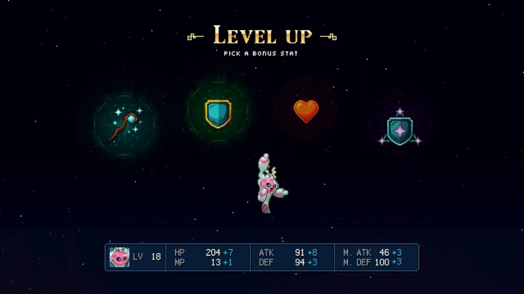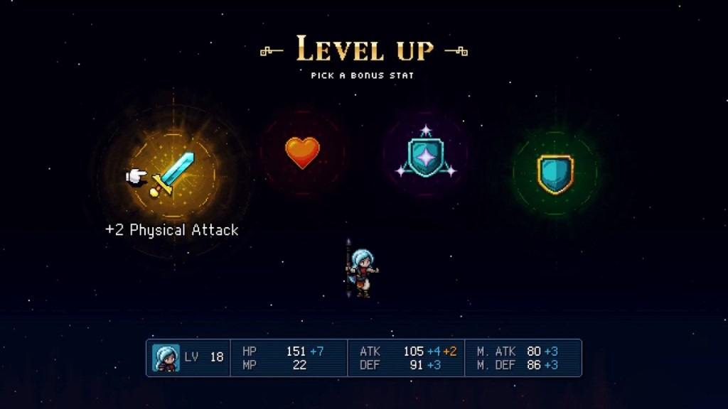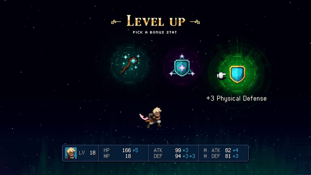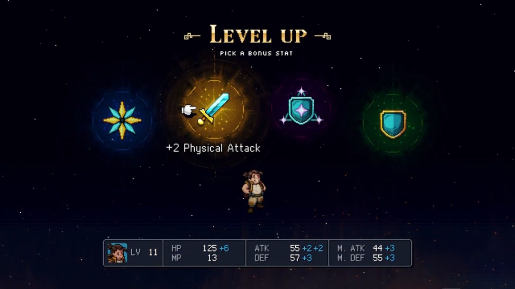 In Sea of Stars, characters level up simultaneously, and you can choose to upgrade their stats in six different areas: magic defense, physical defense, damage, physical damage, HP, and MP. You must balance offense and defense, or your characters will be in trouble. Focus too much on dealing damage, and enemies will likely wipe out the party. On the other hand, not killing enemies fast enough means they get more turns, potentially resulting in everyone’s death.