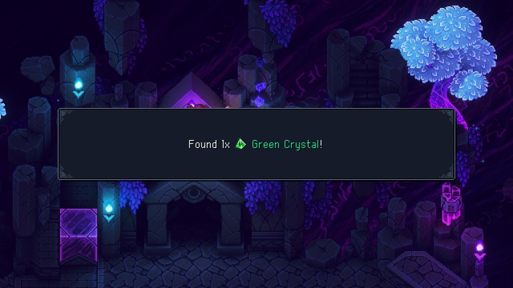 Drop down and stand on the pink rune again, revealing a hidden chest with the Blue Crystal.