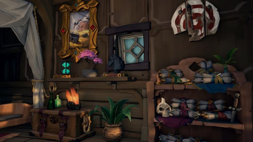 Captains — and their crewmates, if given permission in the menu options — can customize not only the ship’s cosmetics, but the decorations within the Captain’s Quarters too. Additionally, leveling up Milestones allows you to buy Trinkets to decorate your ship further.