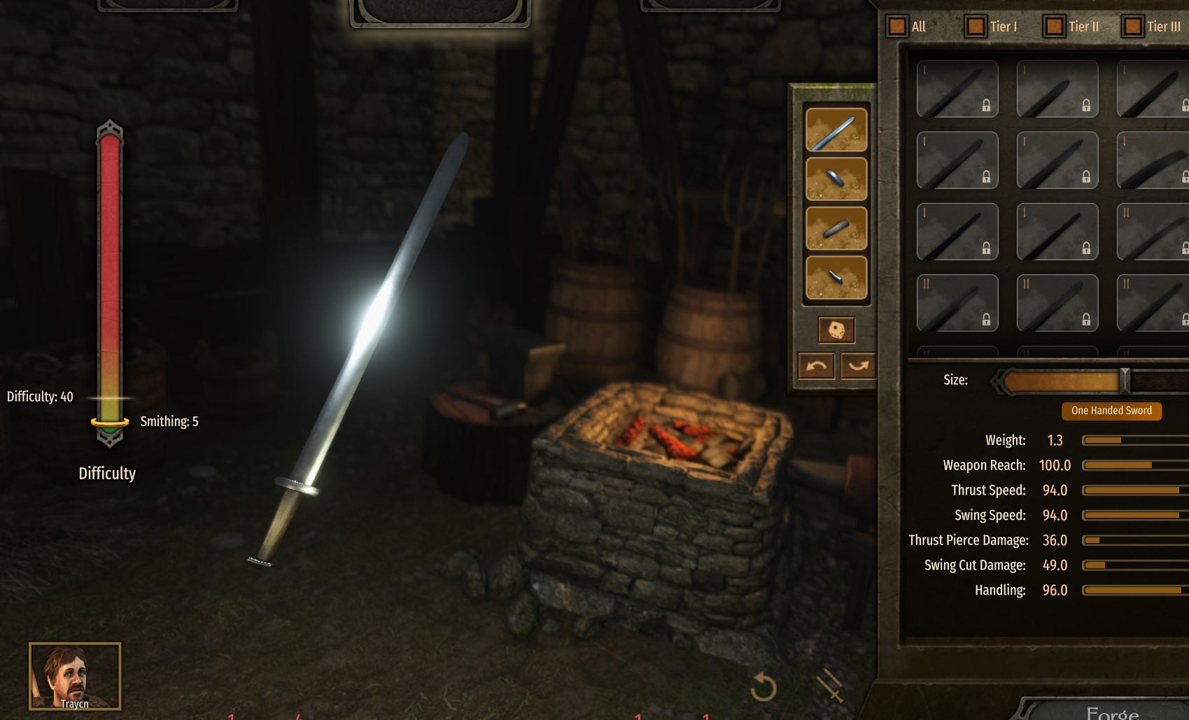 The actual crafting part takes a little getting used to in the game. On the left side you should see a bar, which displays how difficult it is to craft anything. A small line shows your character’s overall skills with smithing. If that small line is higher than the difficulty of the item, you can craft an expect item or something better, depending on your RNG chances. For those just starting out, most of the weapons and things you craft will be worse, to start off, but you can still train your smithing skill by performing the task.