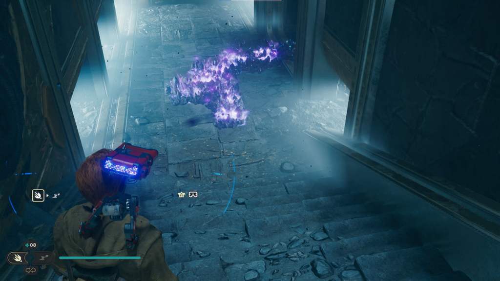 The laser will shoot into the wall, and you can now use BD-1’s Koboh Matter grinder to connect it to the Koboh Matter Wall on the side of the room, burning it away. This will give you access way to follow to the second floor. However, the path forward will be blocked.