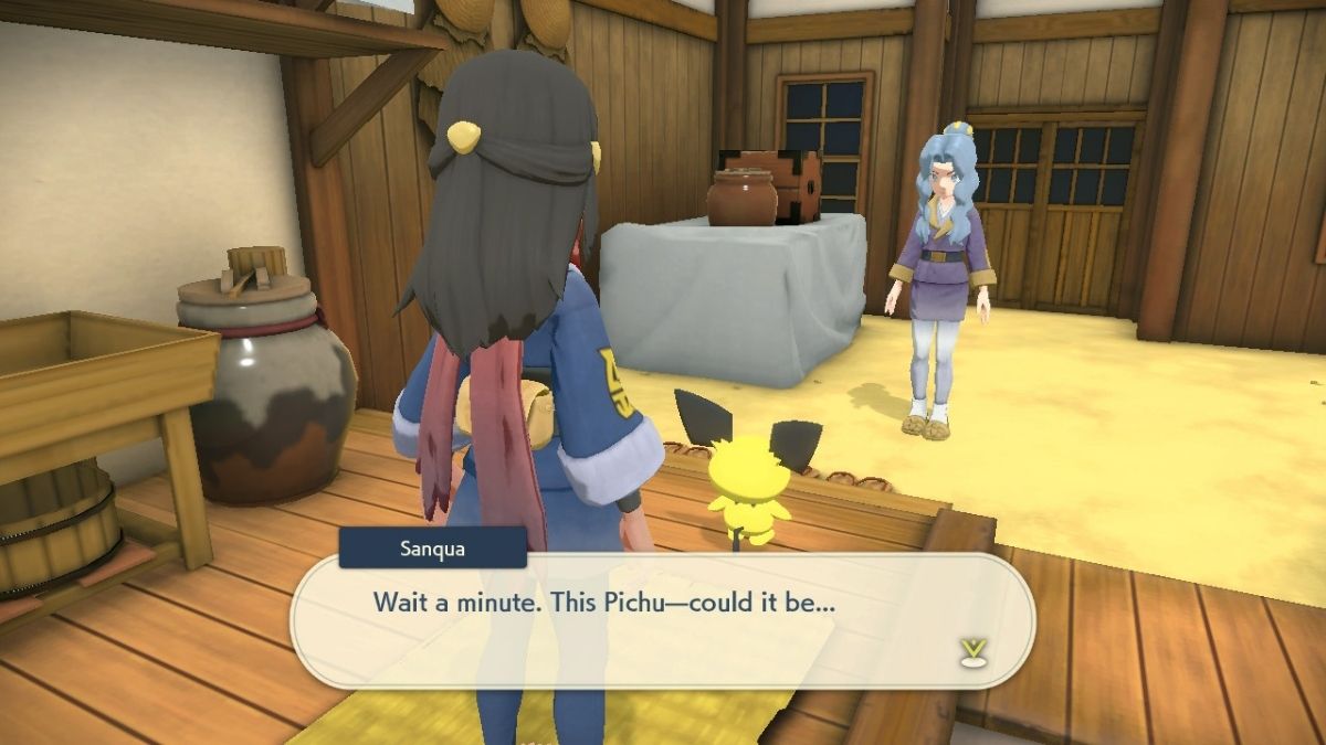 To begin this request, talk to Sanqua. She is located along the central road in Jubilife Village that leads to the entrance of town. Speak to her outside her home and she will tell you that she wants you to investigate the strange things that have been happening in her home. You will need to return at night if it isn’t night already. Rest until nighttime and return to Sanqua.