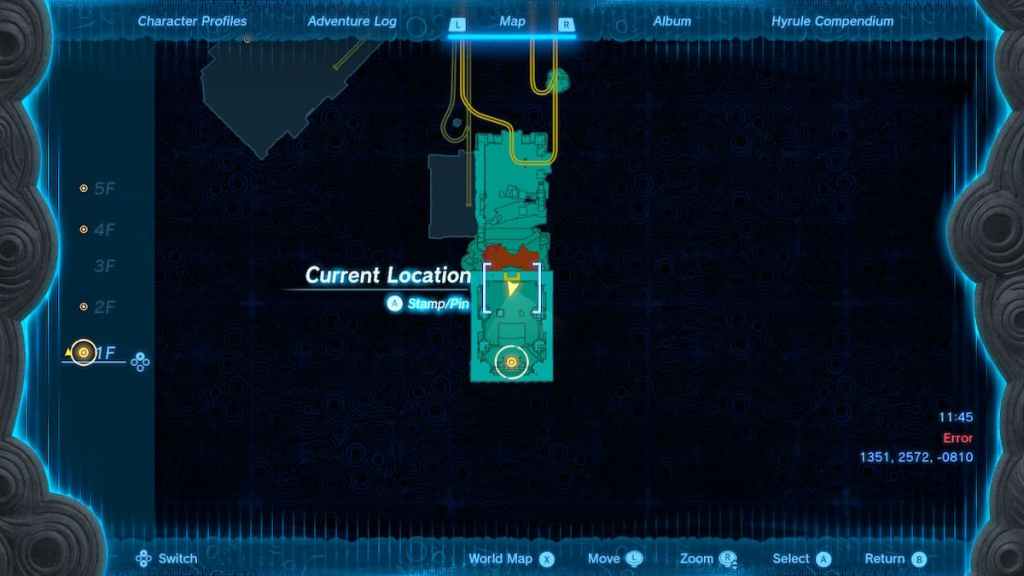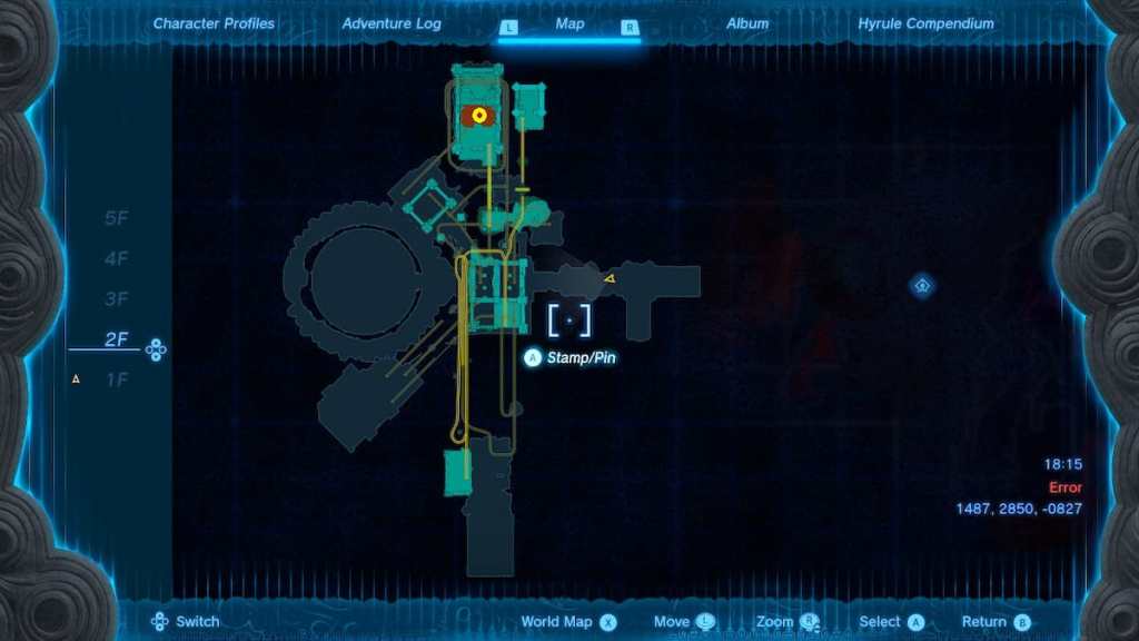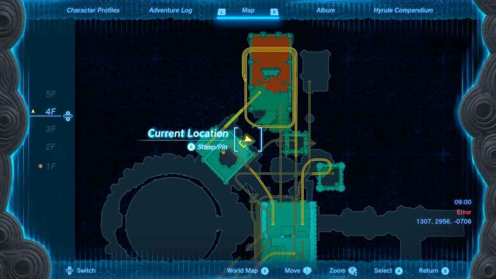 The last Gong is relatively simple to access – reach one of the high points in the dungeon with Ascend (one of the areas near the wooden bridge is a good starting point) and glide into the building that houses it. If you look at the fourth-floor map, you’ll see a yellow line on the east side of the building, depicting an opening. If you glide into the hole, you will be inside the building with the Gong. Just drop down to the bottom and hit it with Yunobo. There is also a button here that will open the door on the first floor, giving you easy access to the previously locked gate.