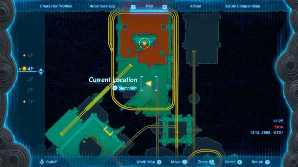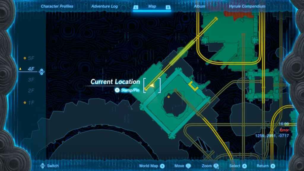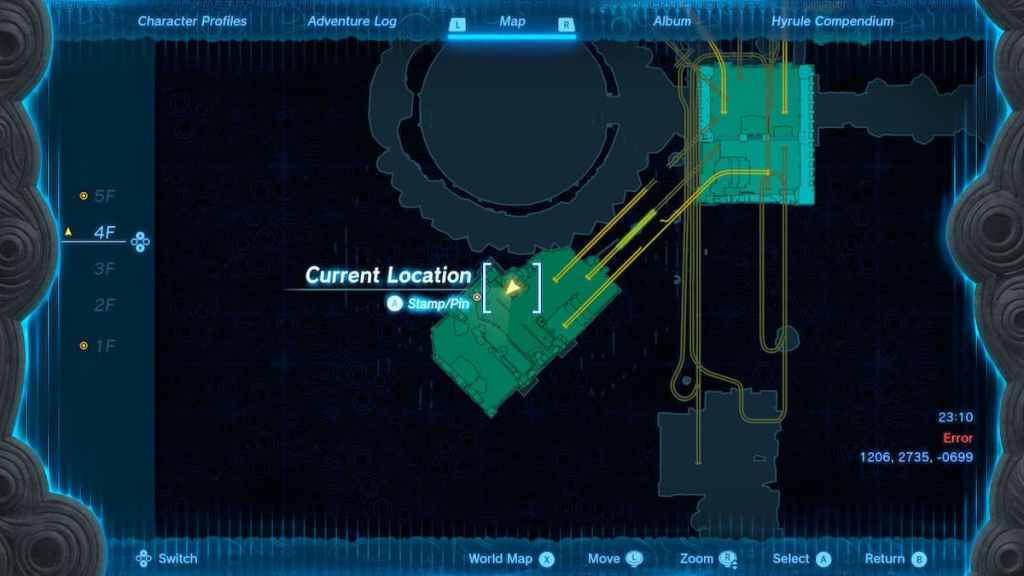 In this area, there is a second track separate from the looping one, leading to an area further up. Climb one of the pillars in the room and glide over. You’ll come to a new landmass, where you can use Ascend to reach the fifth floor, with the location noted in the map below.