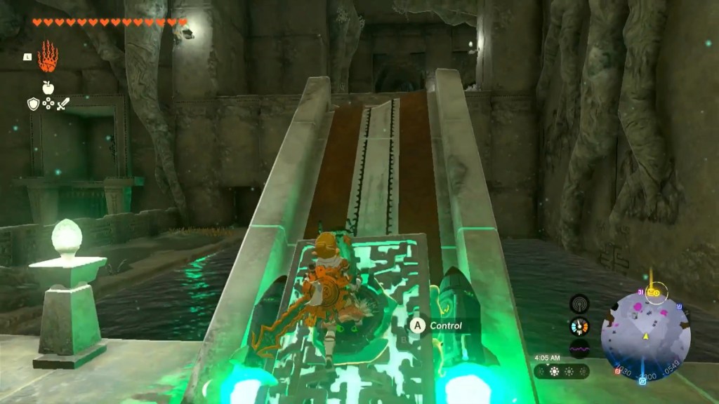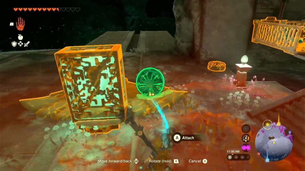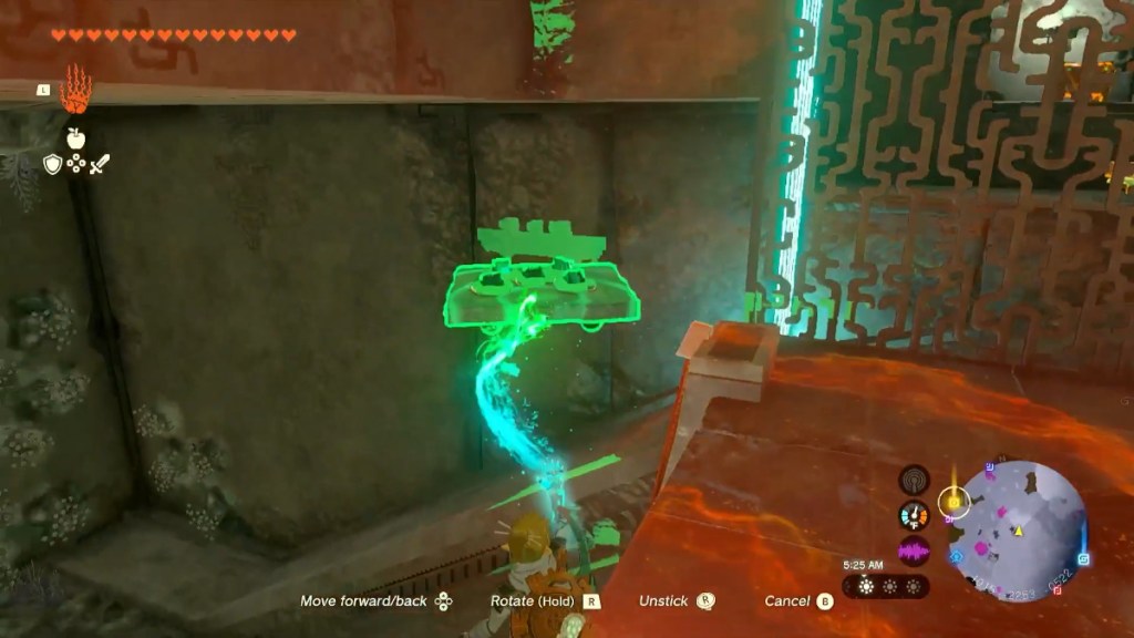 You’ll spot some resources in a higher room, but some laser beams prevent you from reaching them. Climb to the higher room’s left and use Ultrahand to move the slate with the Cart device to the lower floor. Use this rock slate to block the laser beams and access the higher floor’s treasure. Attach the Left Leg to the rock slate and use the Rockets and Steering Stick nearby to fly toward Mineru’s body in the Construct Factory.