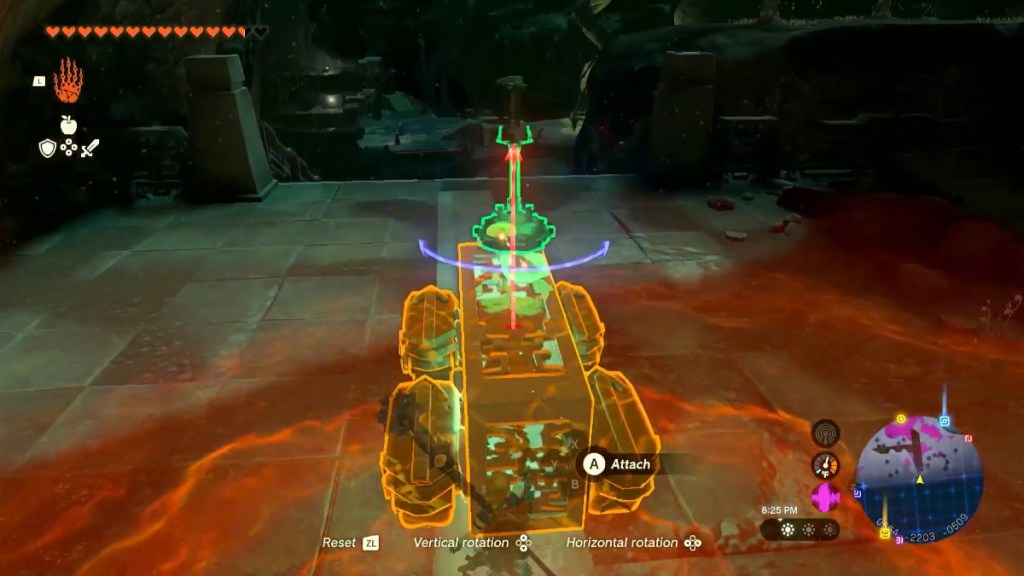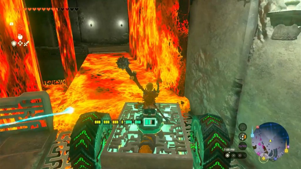Attach two Big Wheels to the right leg and a Steering Stick on top to cross the lava pool. In the next room, rotate the Right Leg to squeeze it through the lava waterfalls. Use the Zonai Devices nearby to make a bridge, or drop them on the lava below to cross over.