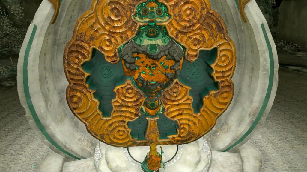 Hit the Big Wheel on the left to lift the door blocking the way. Then, use Ultrahand to take the Right Leg to the next room.