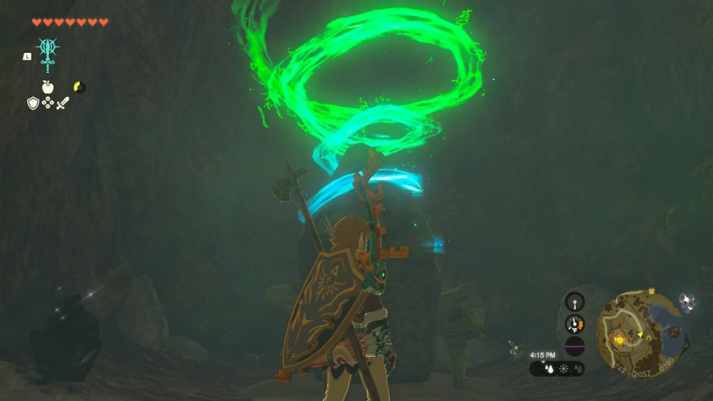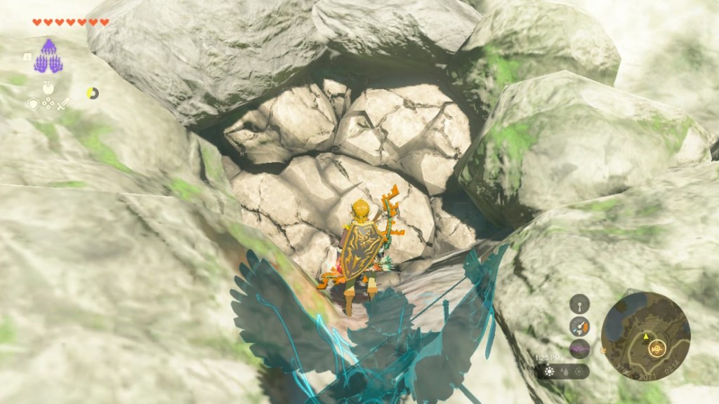 Exit the Hateno Ancient Tech Lab and glide off the mountain. In the apple tree area below, there’s a spot covered with breakable rubble. Use a Tears of the Kingdom weapon fused with a boulder to destroy the rubble and discover a secret cave: Retsam Forest Cave. Need a boulder to fuse a destructive weapon? Two boulders can be spotted at the cave’s entrance left.
