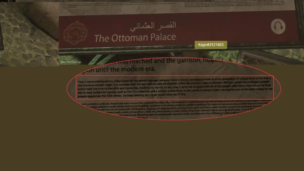 One Infinity Ward developer seems to have hidden a note on the board of Ottoman Palace information board, which can be located on the Al Bagra Fortress map. A lot of the body of text on the board is hard to make out, but the first paragraph has some tongue-in-cheek lines like: “It is my hope that this text will eventually be illegible unlike the previous signs in Modern Warfare, which many diligent people online took the time to translate and transcribe much to my horror.”