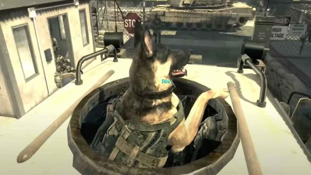 A toy of Riley, the infamous companion dog from Call of Duty: Ghosts, can be seen in a house during the Alone mission. Riley is a military working dog and member of the U.S. Special Operations unit, which consists of Riley, his caregiver David “Hesh” Walker, and Logan Walker. The toy found in Modern Warfare 2 is the same model as the weapon charm featured in its predecessor’s multiplayer mode.
