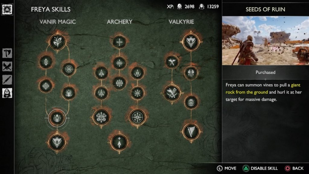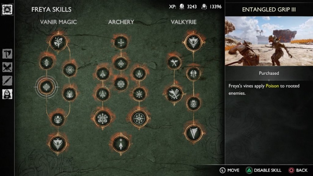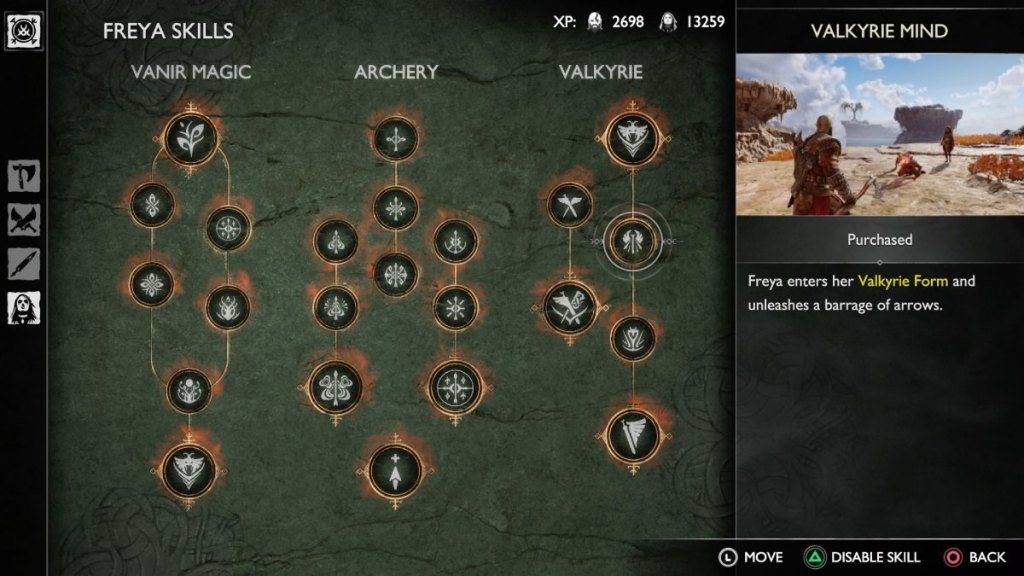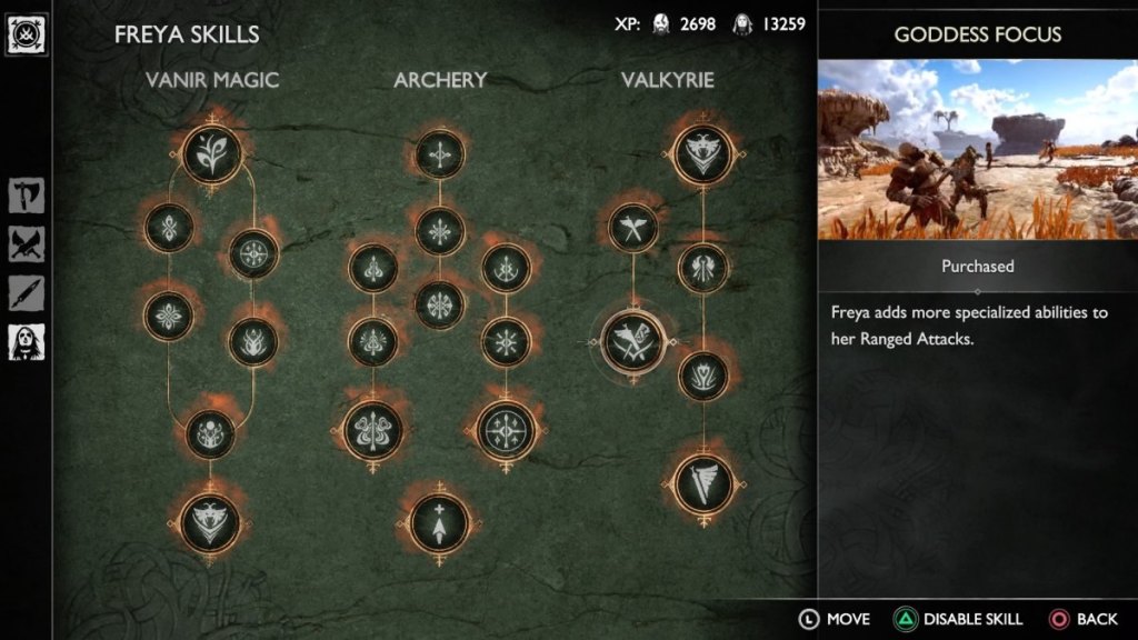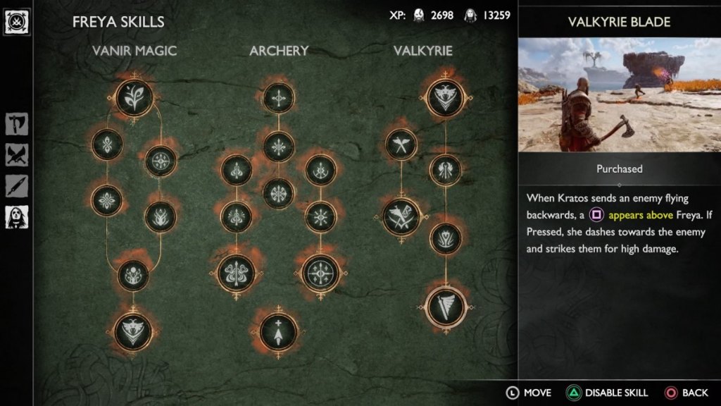 To show the wrath of a Vanir Goddess, Freya can become much more aggressive through the Goddess Aggression skill. She engages more in combat by parrying and charging enemies a lot which can certainly help Kratos a lot. This is beneficial when Kratos has to take on much tougher enemies or a bunch of weaker ones.
