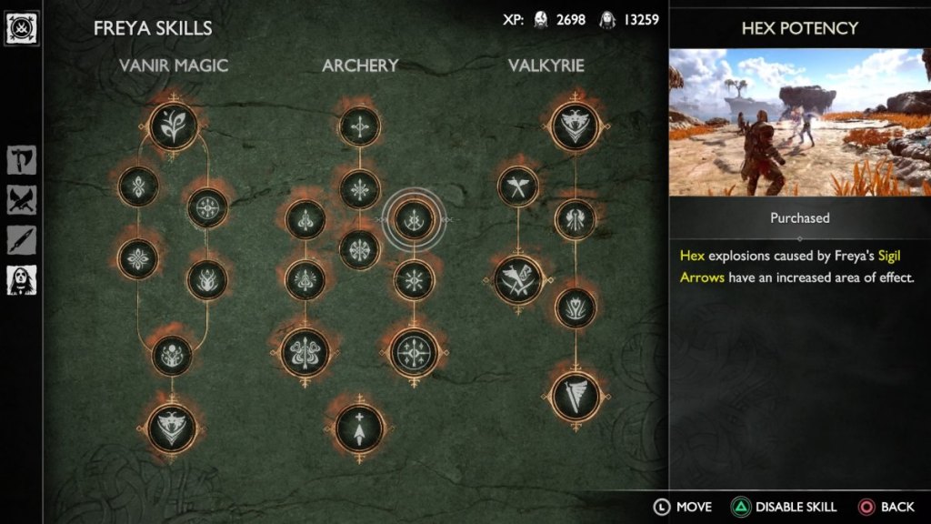 Sigil arrows are really useful through God of War Ragnarok and are sometimes deadlier than the Sonic Arrows, as such upgrading them is necessary. The Hex Potency skill increases the area of effect of the Hex explosions caused by Freya’s Sigil arrows. This is quite handy against a group of weak enemies they’ll be quickly taken out.