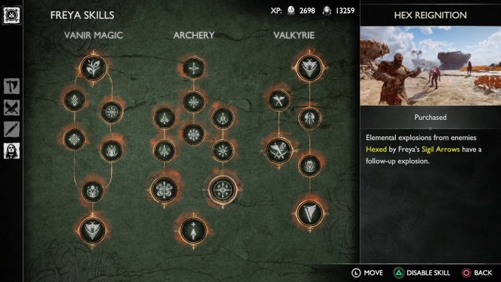 The Hex Reignition is another skill you can acquire for Freya’s Sigil Arrows. With this, when an enemy is hit with Hex explosions from the arrows, another explosion will follow soon after. This is functional in taking out taking weaker enemies in one or two shots with the arrows.