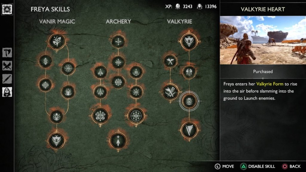 A powerful skill for Freya’s Valkyrie form is the Valkyrie heart. Through this, Freya rises up into the air and slams into the ground to launch enemies. This can do a good amount of damage to enemies while also making them vulnerable. Then, Kratos can step in to finish them off quickly.
