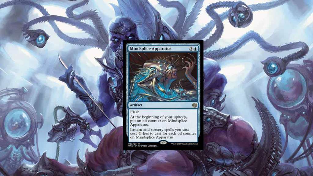 Blue decks are known for their powerful instant and sorcery cards, which can be helped by playing a Mindsplice Apparatus onto the field. When Mindsplice Apparatus is used, it enters with an oil counter and reduces the cost of all instant and sorcery spells by one for every oil counter on the card.