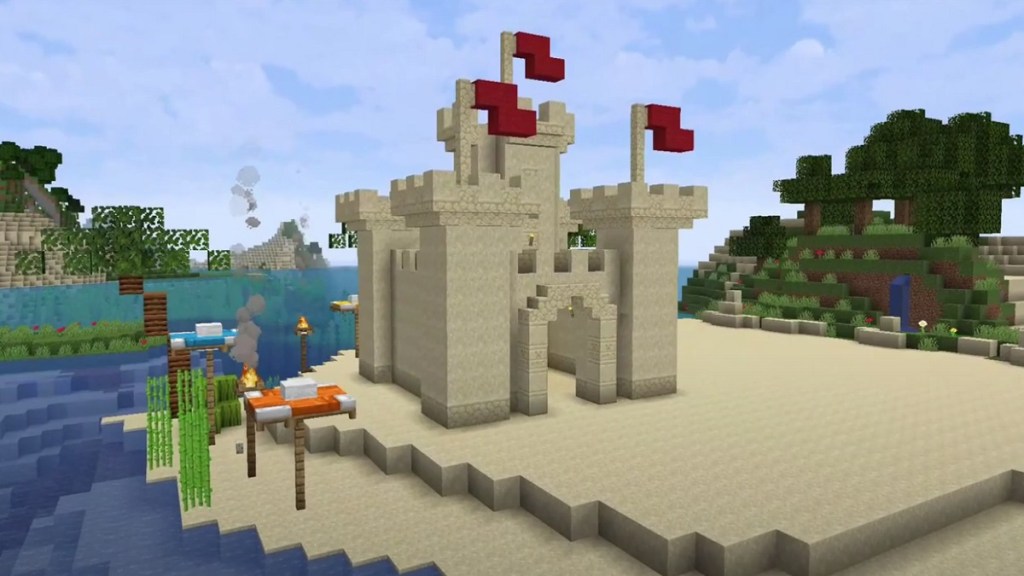 Relive your childhood fantasies through this beautiful sandcastle design. It is fairly simple to make, with the majority of the structure requiring sand blocks. Add flags on top of the castle and put some fire torches around to give the finishing touches.