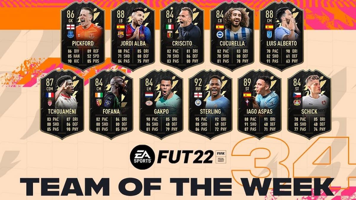 Manchester City star Raheem Sterling is the headliner here, as the English superstar now has a 92 OVR Team of the Week card in FIFA 22. Fans of the Spanish national team should also be happy with this update, as four native Spaniards (Marc Cucurella, Jordi Alba, Luis Alberto, and Iago Aspas) are a part of the Starting XI for Week 34.