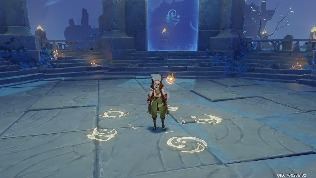 Look for the single notch, then make your way to the door marked with that sigil. Walk into it and you will be turned into a ball of lighting and returned to the center of the area. Do this from one to five, activating all five doorways, and a chest will appear in the middle of the area.