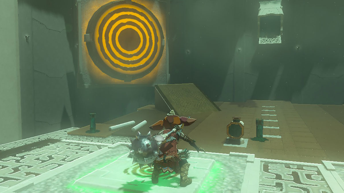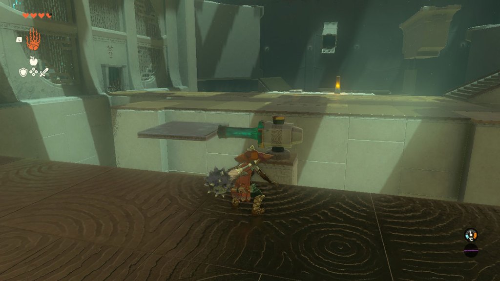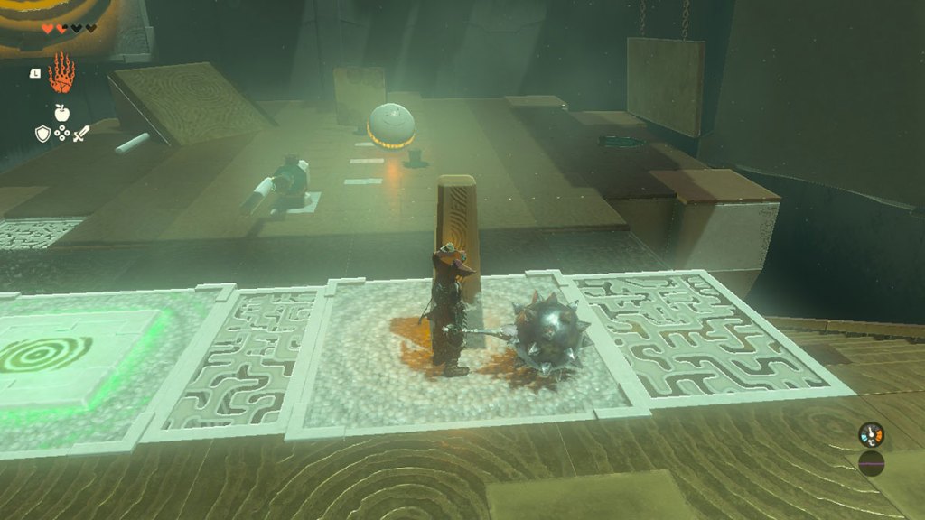 After the target on the left turns green, a target on the right-hand side of the room will appear. Hitting it with the sphere will open up the second gate, allowing Link to reach the chest beyond. Before creating a solution, players need to use a Zonai spear to pin the hanging slab on the right-hand side of the room to the top of the block above it. This will clear the way for the sphere.