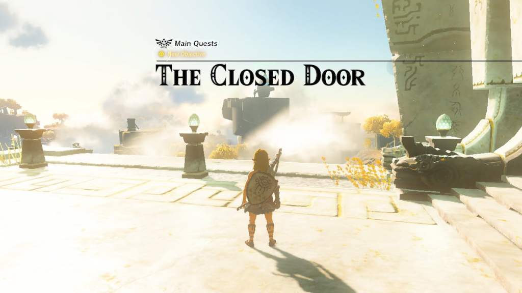 You will receive The Closed Door quest shortly after you attempt to open the front of the Temple of Time, which is associated with the Find Princess Zelda quest you receive when you start Tears of the Kingdom. Shortly after reaching the door, Rauru appears to tell you that your Ultrahand is not fully charged yet, and you need to visit all shrines on the Great Sky Island to reactivate it.
