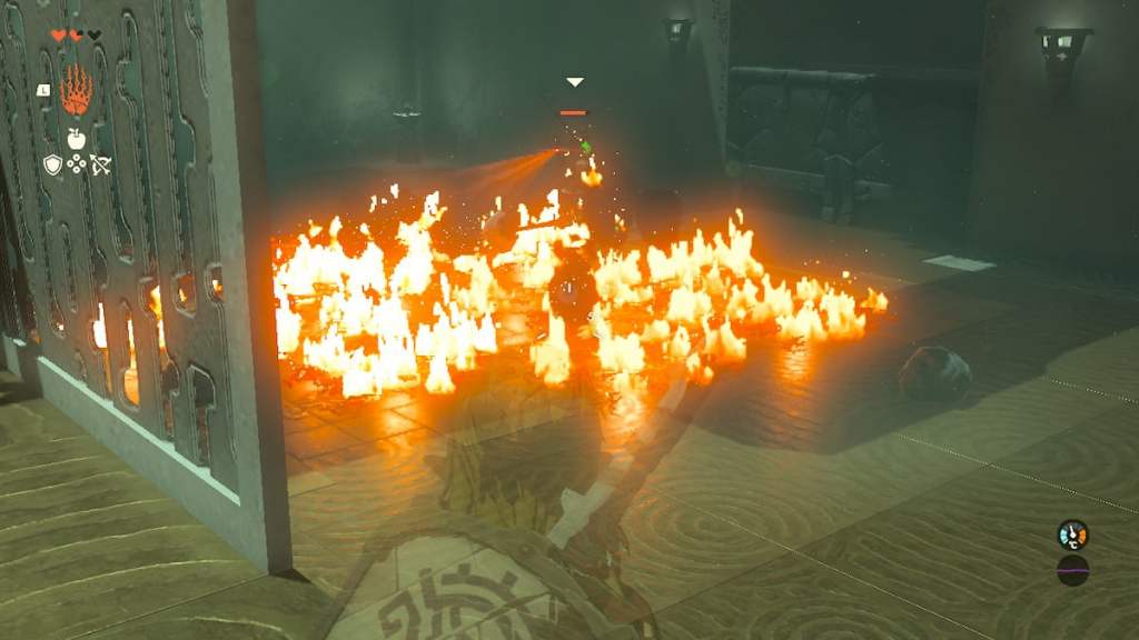 When you reach the room on the other side of a door, there will be a Tears of the Kingdom Zonai that you need to battle against. It’s much stronger than the others you’ve already fought. We recommend going to the platforms to the left or right of the room and grabbing the Fire Fruit from these locations. You can then attach them to your arrows using Fuse, and then light the vines underneath the Zonai, damaging it.