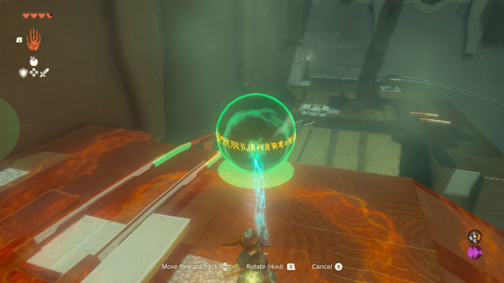 The third part of Runakit Shrine puzzle in Tears of the Kingdom gives Link one rail on which to slide the sphere to its final destination. To do this, we attached two corner slabs, the ones made up of two slabs at a right angle to each other, to the sphere. This created a sort of cage in which we hoped the rail would sit. We then positioned the sphere and its new extensions over the rail as far away as possible, and, to our amazement, it slid down to the starting platform. From here, move the sphere into the platform’s recess to unlock the Runakit Shrine exit.