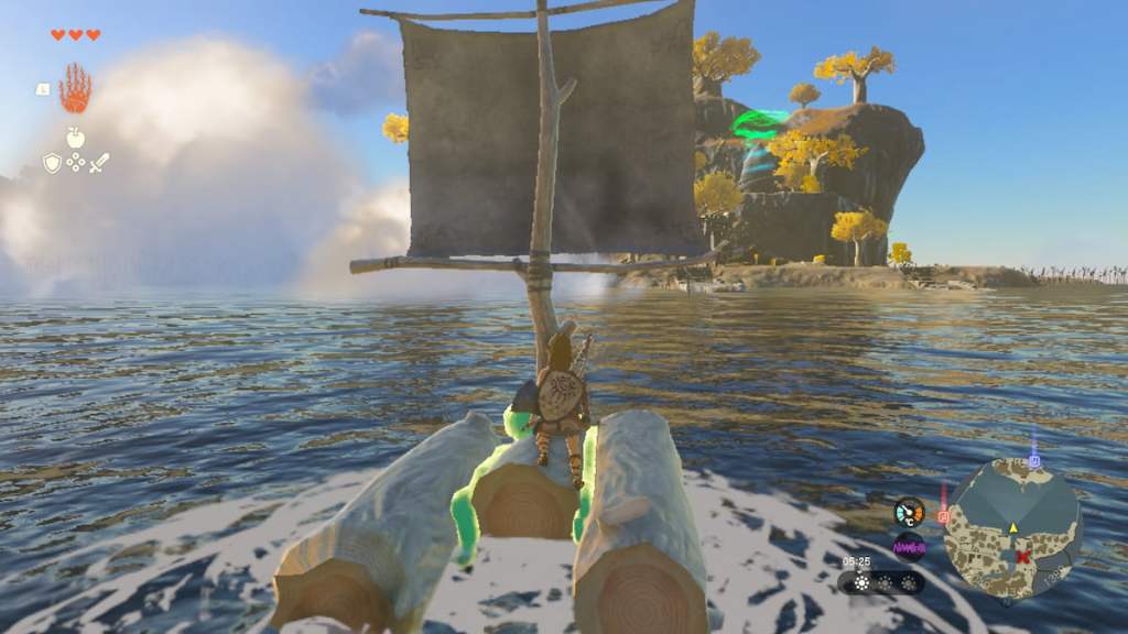 If you’re only creating a boat with a mast, make sure there’s a gust of wind to support it. You’ll be able to tell that it’s windy in Tears of the Kingdom by Link’s hair moving behind him or the trees shaking around him, with the leaves looking like they’re about the fall. This means it’s a good idea to use a mast. When you decide to use a mast, make sure to place at least two wooden logs together using the Ultrahand.