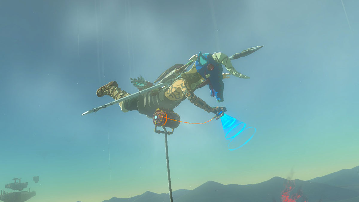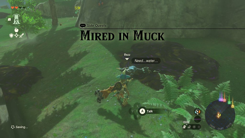 Once Link arrives at Upland Zorana Skyview Tower, he’ll see that the door is blocked by the same sludge that coats the cliffs he’s just climbed up. There’s no obvious way to get rid of this sludge, and the only thing he can do apart from stand around and look pretty is speak to the poor nearby Zora who’s slowly drowning in the stuff. This Zora, named Bazz, complains that the sludge is choking him, and he needs a way to wash it off. After speaking to him, a new quest called Mired in Muck will begin.
