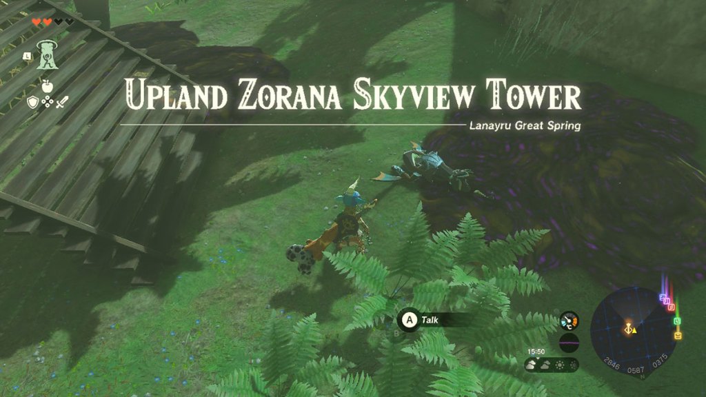 Players can find the Upland Zorana Skyview Tower at map coordinates 2846, 0587, 0375, close to Lanayru Gret Spring. It’s on top of the cliffs that divide the area and have ruined buildings all around them. The best way to reach it is to head to the lower end of these cliffs and then climb them, dodging the sludge as it blocks the way.