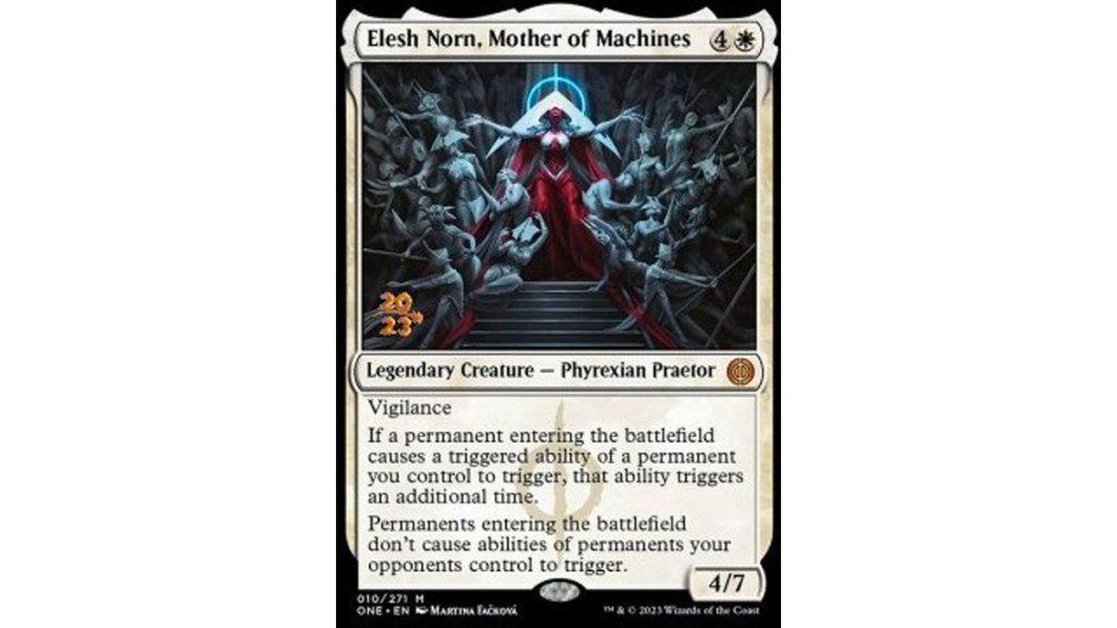 Elesh Norn is, as the card suggests, the mother of all machines. She’s the leader of the Phyrexians, though her appeal in a deck is less about what she can do and more about having such an imposing character on the field.