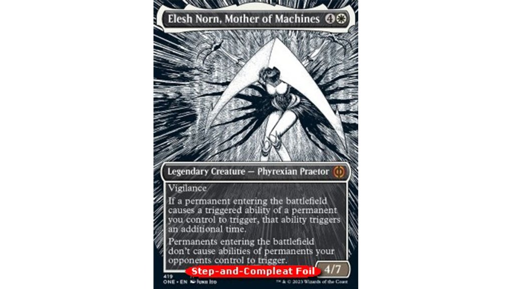 This version of Elesh Norn is the Step and Compleat Foil without Junji Ito’s artwork. It’s still stunning in its own right, which is why it’s so sought-after, highlighting the teeth on Elesh’s arm blades.